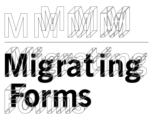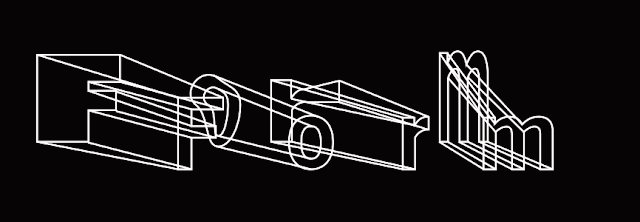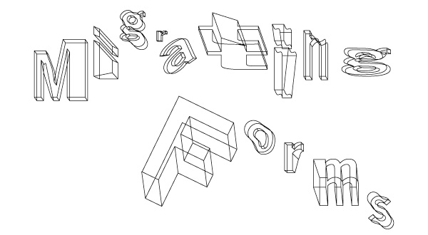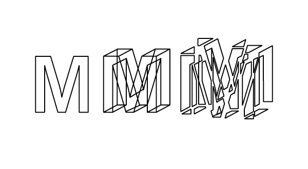 The solution was to simplify. Designer Kyle Richardson returned to a 3D "wireframe" of an "M" in News Gothic and took a different point of departure: the triangles, parallelograms, and other latent geometries that the eye sees haphazardly in a 3D image (see the middle image below), causing it to shuttle back and forth between flatness and depth. The extruded "M" appears to be a representation of a three-dimensional letterform, but a closer look reveals that each plane is actually a separate and disconnected shape. To further emphasize the effect, Kyle subjected those geometries to a process of subtraction that fragmented and further abstracted the letterform while preserving its overall shape. The result is the image on the right: