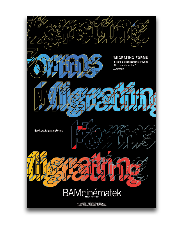At BAM, it isn't uncommon for the seed of a design idea to originate with a print designer and only later make its way to the video team for adaption there. This makes sense when a campaign calls for more postcards and brochures, say, than video trailers. But for Migrating Forms, a boundary-pushing film and video festival now in its third year at BAM, we turned that model on its head. Apropos of the festival’s name and cinematic bent, ideas were passed back and forth between print and video, each informing the other, to create an identity that honors its shape-shifting subject in a multitude of ways.