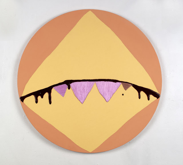 | Amanda Valdez, ghost pilot, 2015. Embroidery, gouache, acrylic, and fabric. 20” diameter. |