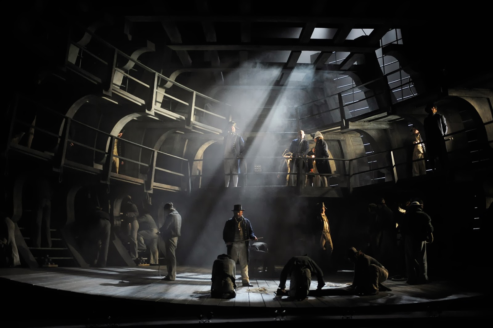 In January 1949, Benjamin Britten, librettist Eric Crozier, and novelist EM Forster met at Britten’s home in Aldeburgh, on the Suffolk coast, to discuss ideas for a new opera, based on Herman Melville’s novella Billy Budd. “Ben made a rough drawing of what he thought a three-masted schooner was like, going by what Melville had written,” Crozier recalled in a recent documentary. “That was the exact genesis of the opera.” The battleship, HMS Indomitable, with its various decks, cramped quarters, and maze of public and private spaces, contains the whole world of Billy Budd. It is a world of men; the absence of the fairer sex is striking. (Treble voices are supplied by kids playing the “powder-monkeys,” boys who carried gunpowder on warships.)