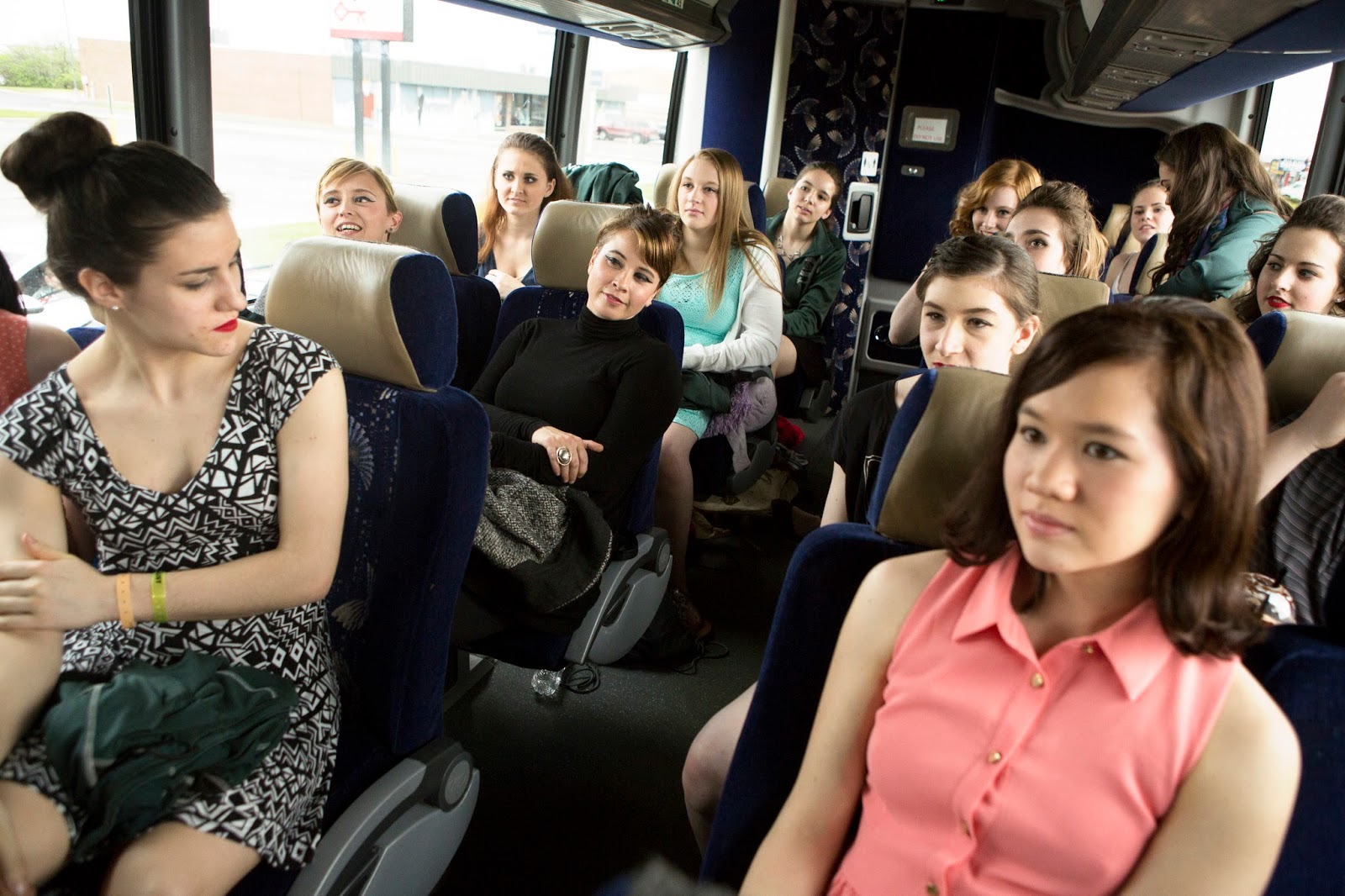 The team—whose competition performance routine is inspired by Hitchcock films, complete with shower curtains!—hears Lucius’ original composition for them for the first time on their tour bus: