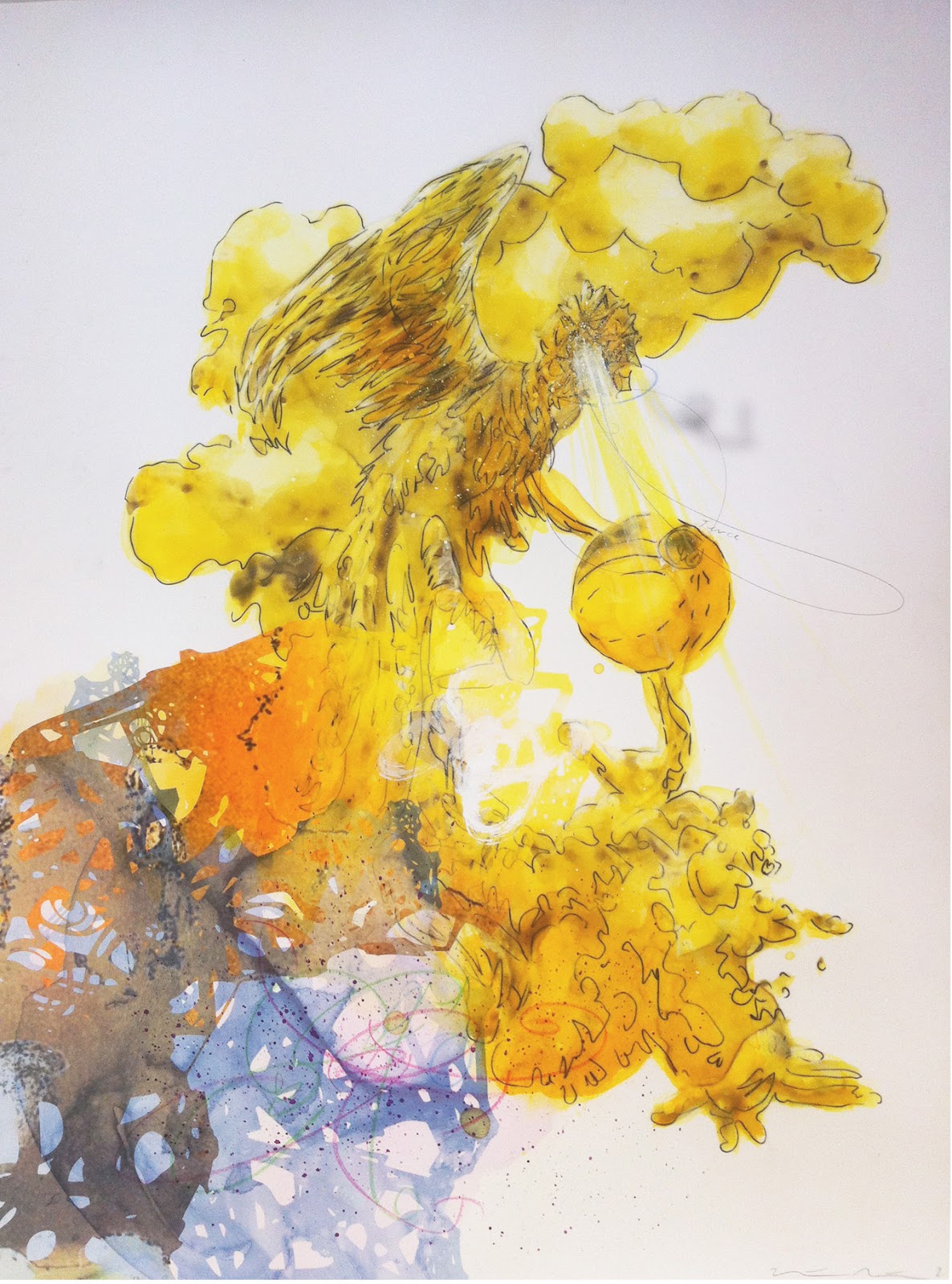 If Matthew Ritchie is more your style, why not check out Leif Ritchey. With similar names, but no relation, and similar palettes in both these works—lush yellows with touches of blue—you can see Ritchey’s work in the group show New Traditionalists at Chelsea’s Martos Gallery alongside the wonderful B. Wurtz.