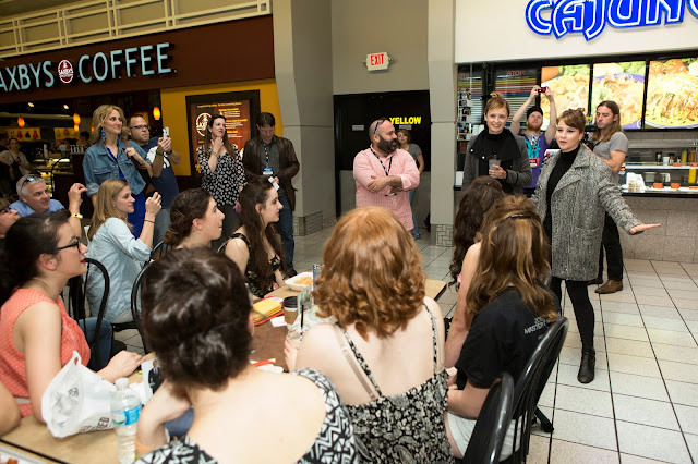 Jess and Holly from Lucius meet their team Shenendahowa High School for the first time at a local food court. Camera phones abound:
